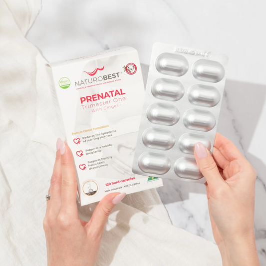 With Prenatal Trimester One, you can rest assured some of your unique nutrient needs are covered as well as being specially formulated in a way that reduces the frequency and severity of nausea and vomiting in pregnancy (morning sickness). Clinically formulated by an experienced fertility naturopath, this is Australia’s first pregnancy multivitamin with 75mg of vitamin B6 and 1300mg of ginger to reduce morning sickness. It provides B vitamins in their metabolically active forms to support healthy methylation, DNA and RNA synthesis and homocysteine metabolism.